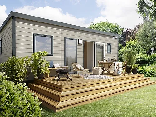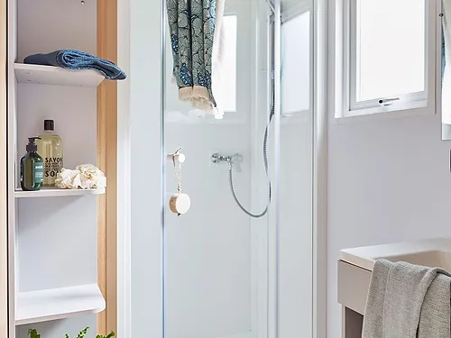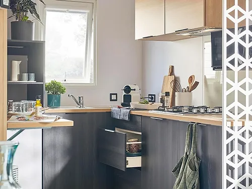 La originalidad de esta nueva casa mรณvil es la cocina situada en la parte trasera, que sin duda le encantarรก. Esta distribuciรณn permite disponer de un espacio mรกs aireado y separar mejor la cocina del salรณn. No le falta nada en cuanto a equipamiento: placa de cocciรณn de 4 fuegos, fregadero de acero inoxidable, encimera abatible, detector de humo, armarios. El salรณn tambiรฉn estรก totalmente equipado para disfrutar de momentos de convivencia y relajaciรณn.